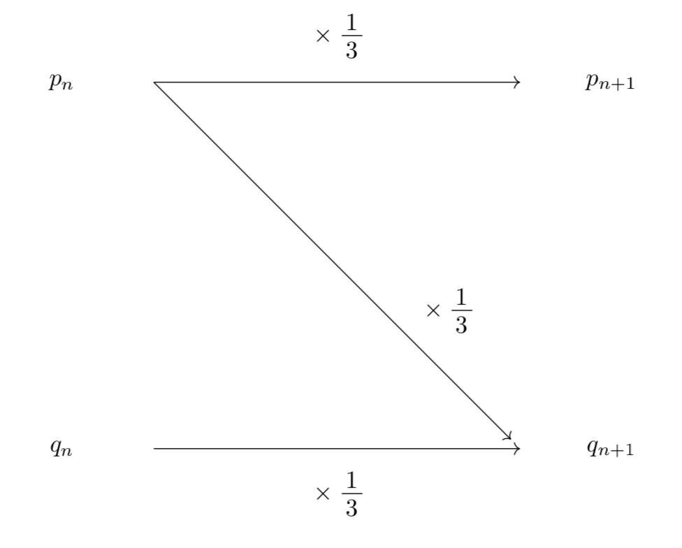 回のじゃんけんのあと、3人が残っている確率を、2人が残っている確率をとおくと、3人で一回じゃんけんをするときに誰か1人だけが負ける確率は、あいこになる確率はであり、2人で一回じゃんけんをするときにあいこになる確率はであることから推移図は以下のようになる。