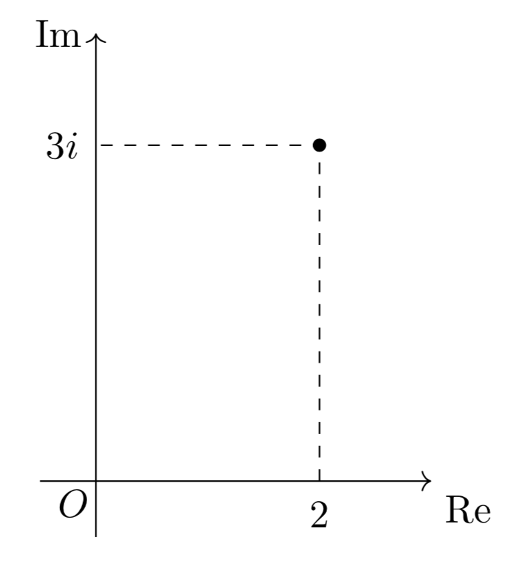 例えば2+3iを複素数平面上にプロットすると以下のようになります。