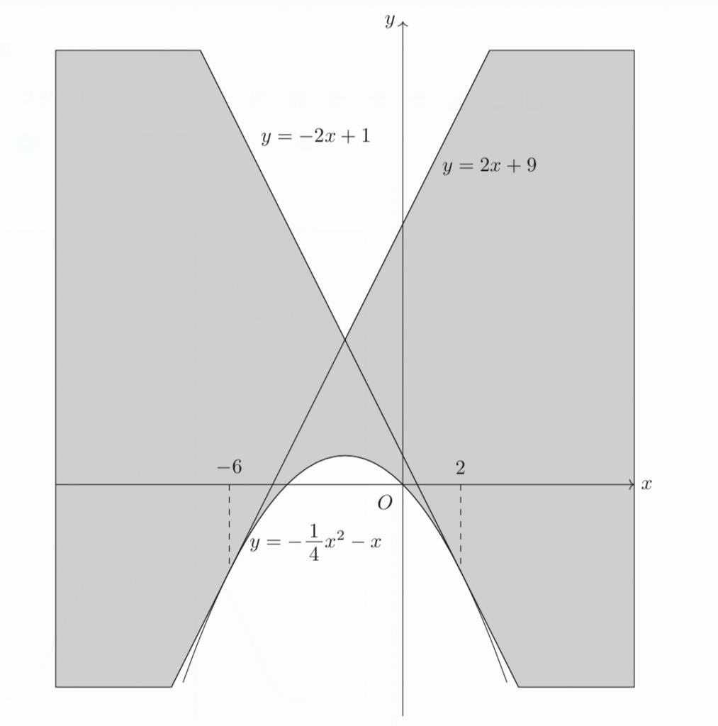 このように、ある座標に対応するを代入しての方程式を解き、問題文で与えられた範囲に解を少なくとも1つの解を持っていれば、その点は求めたい領域に含まれることになります。