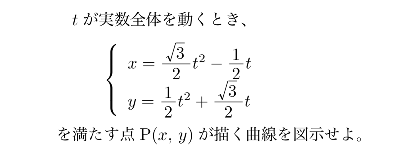 このようにして、パラメータによってベクトルを整理してあげることによって放物線を回転させたものが求めるべきグラフだということが一目瞭然ですね。