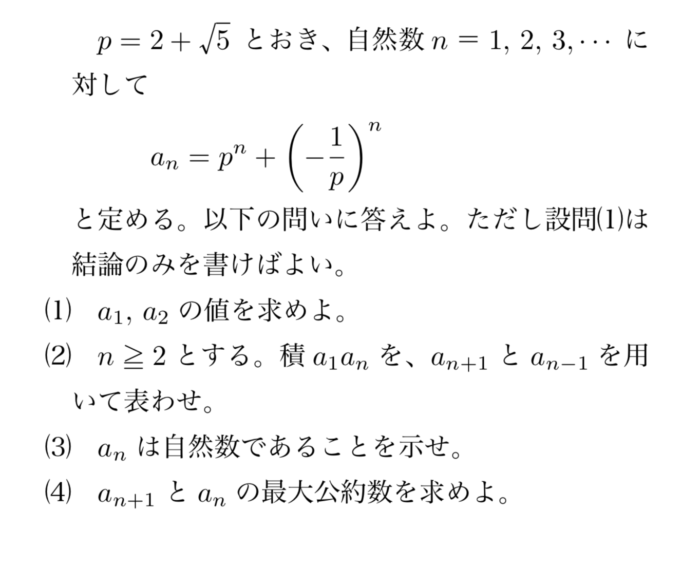 (3) (1)よりs1,s2はともに整数であり、n≧3においてsn=4sn−1+sn−2が成り立つので、帰納的に任意の自然数nについてsnは整数であるとわかる。