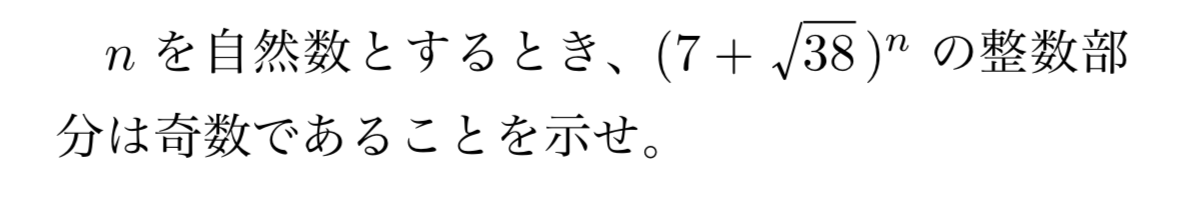 が成り立つので、(7+38)nの整数部分が奇数であることが示された。