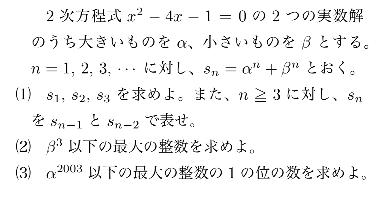 となることです。よって、snに0より大きく1より小さい数を足した数がαnになるので、α2003の整数部分の1の位を求めるという問題は、s2003の1の位を求めることと等しいと分かります。