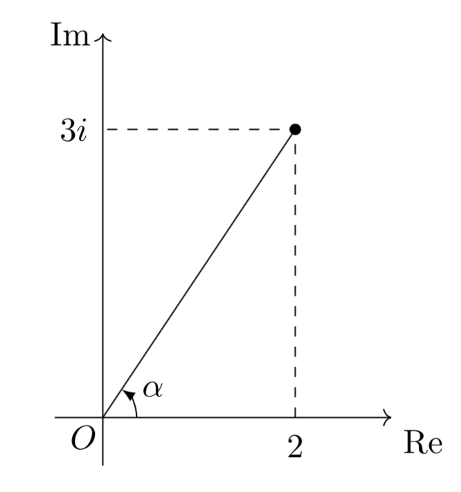 2+3iは原点からの距離が13の点なので、0<α<2πを満たす実数αのうちcosα=132,sinα=133を満たすものを考えると、