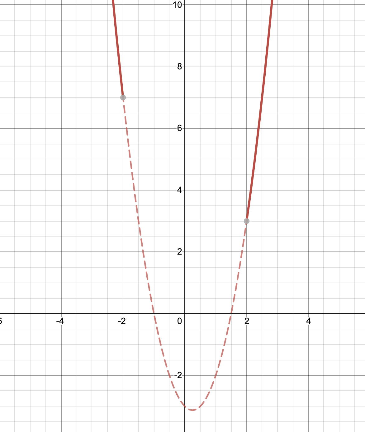 となることに注意して、X≦−2,2≦Xにおけるy=2X2−X−3のグラフを描くと以下のようになる。