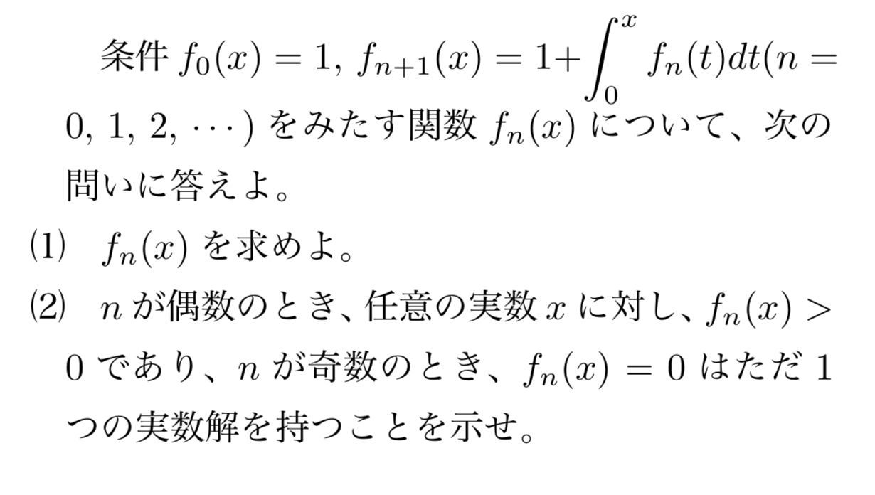 積分漸化式によって定義された関数を求める問題です。(1)は、結果を予想して数学的帰納法によって証明することで求まります。