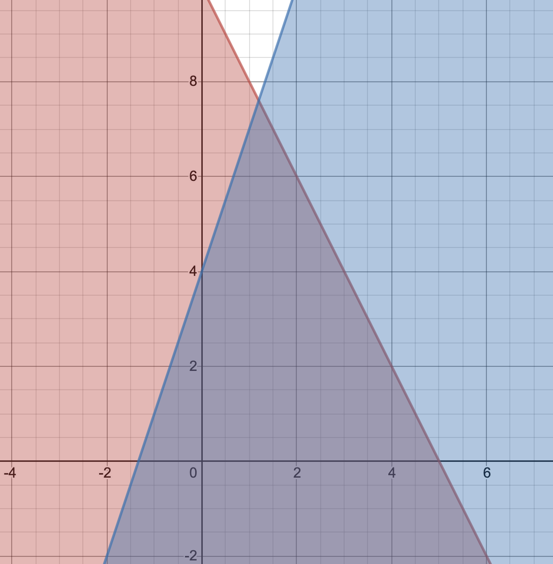 2式を同時にみたすときというのは、この青と赤の重なった領域内にあるときに等しく、このうちyが整数で最大になるのは、図からY=7のときだと分かります。