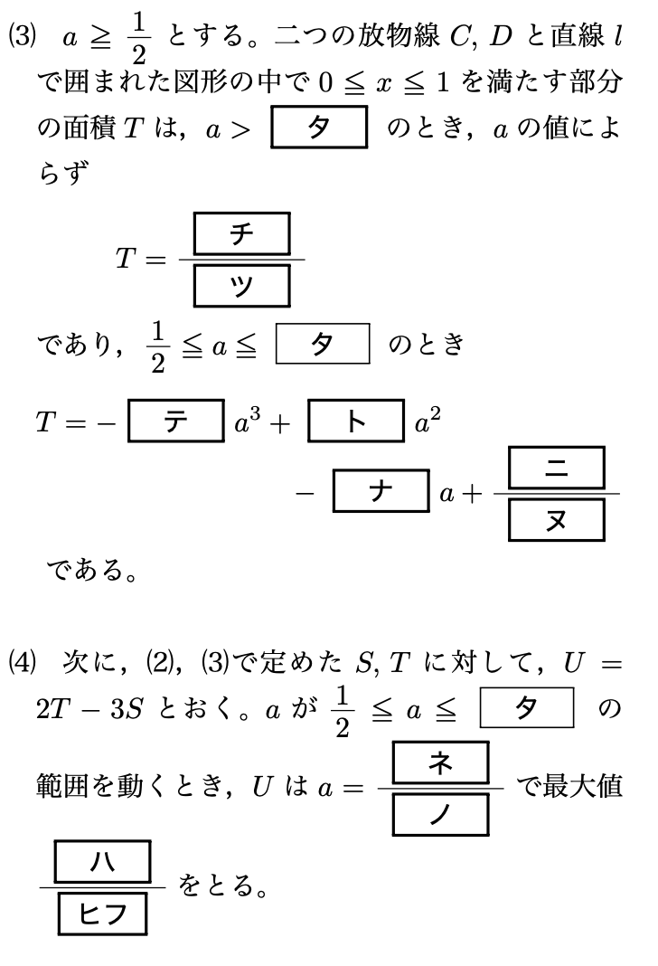 よって、a>1のときにtは一定で、先程求めた面積の式にa=1を代入して、