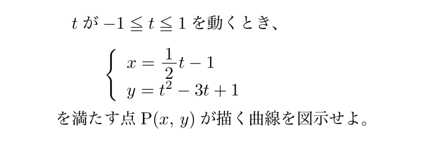 また、この解法はパラメータを消去した結果、簡単に図示のできる関数になった場合には上手くいきますが、どのような関数なのかわからないときには、陰関数の微分を使って図示をすることになります。