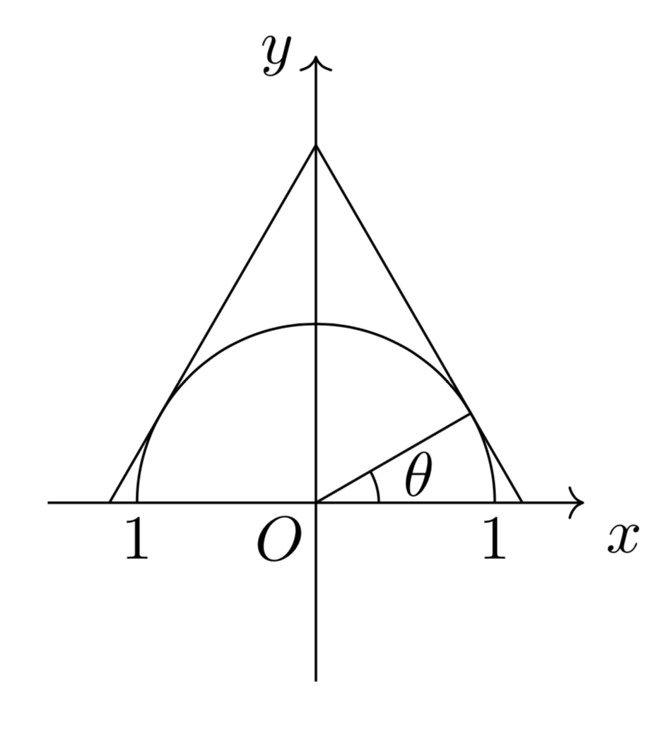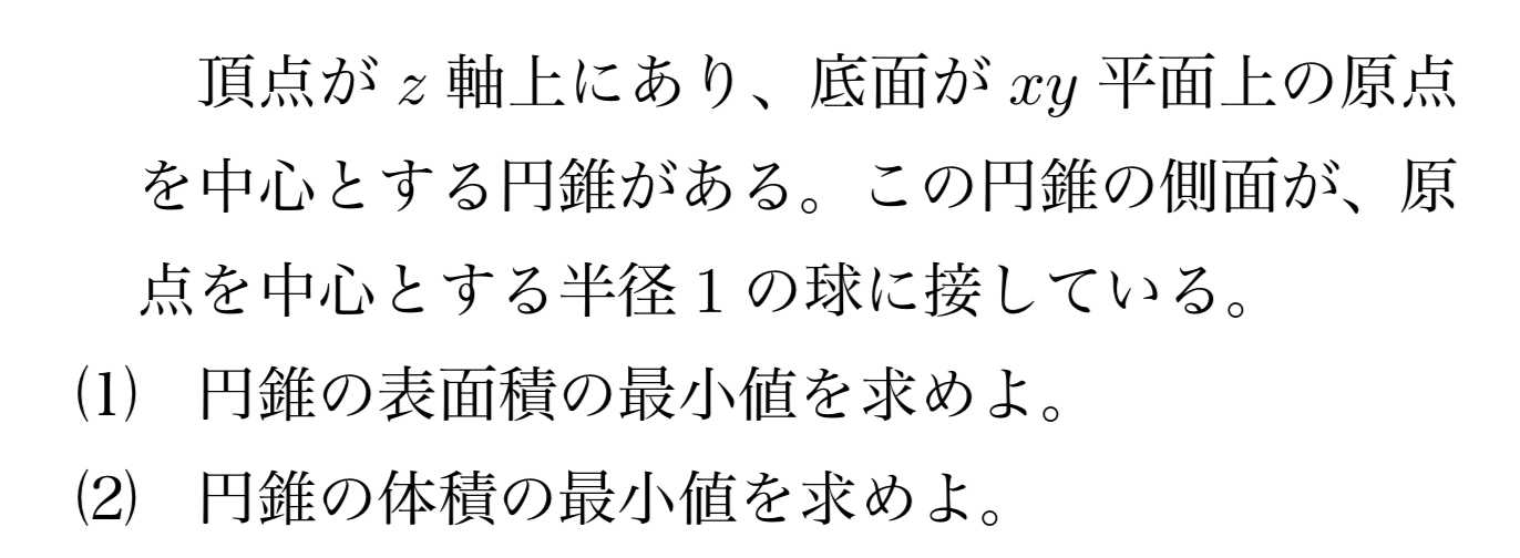 上図のようにθとおけば、母線の長さや半径、円錐の高さなどが簡単に計算できます。表面積や体積は最終的にsinθだけの関数になり、t=sinθなど適切な置き換えをすることによって最小値を求めることができます。