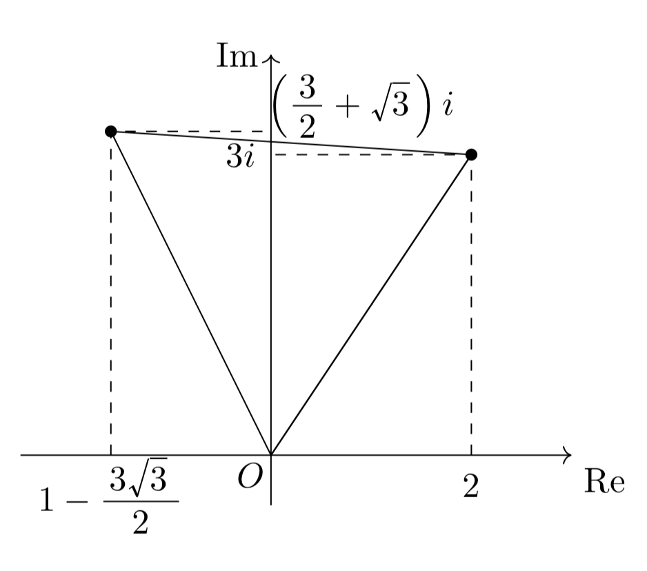 文系数学の範囲内の知識では、回転に関する記述をするのが難しく、ベクトルなどを用いても説明が冗長になりがちです。そこで、xy平面を複素数平面に対応させてから、回転に対応する複素数をかけて、xy平面に戻すという作業をすると非常に簡単に記述ができます。