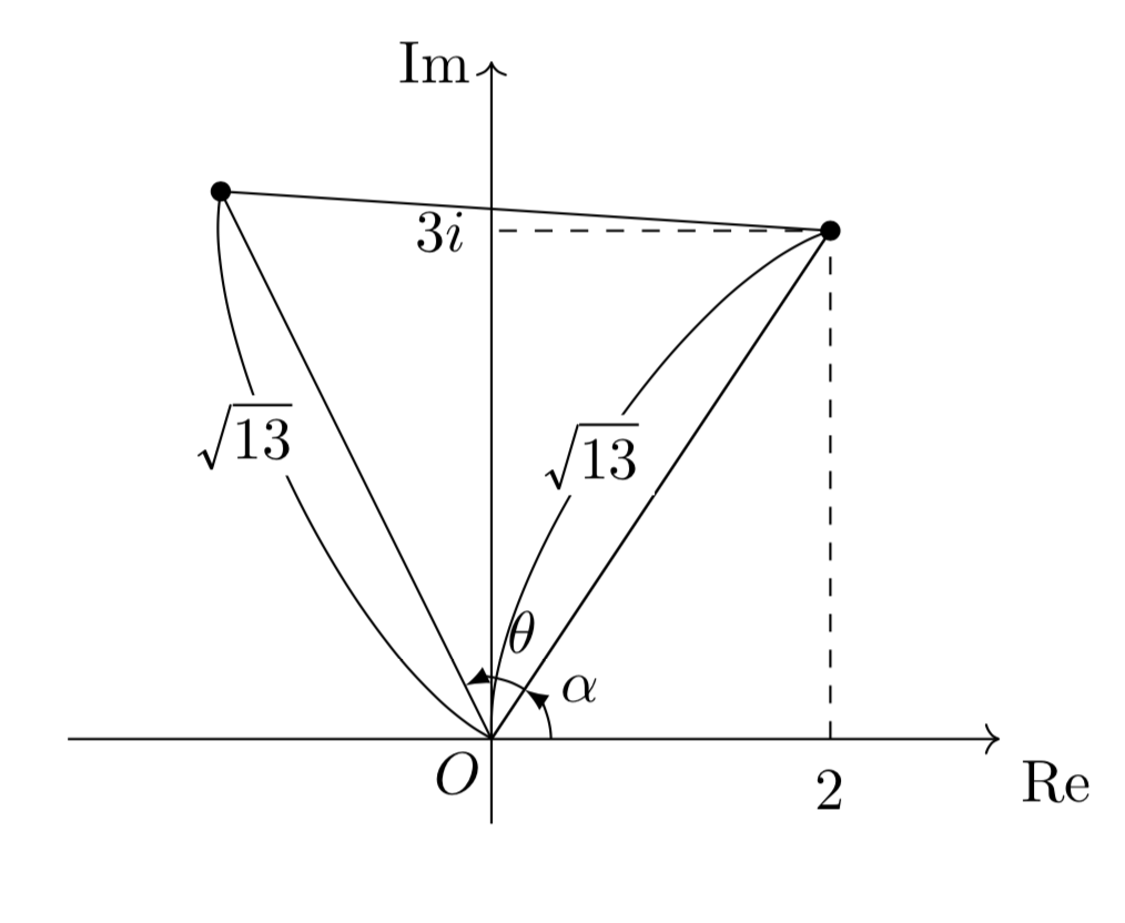 2+3iは原点からの距離が13の点なので、0<α<2πを満たす実数αのうちcosα=132,sinα=133を満たすものを考えると、