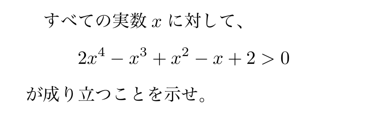 4次関数が常に正の値を取ることを示す問題なので、パッと思いつくのは微分して増減表を描いて、という解法ではないでしょうか。しかし、微分したあとに出てくる3次式は綺麗に因数分解できない式になっているので、もう一度微分して常に正であることを示して…