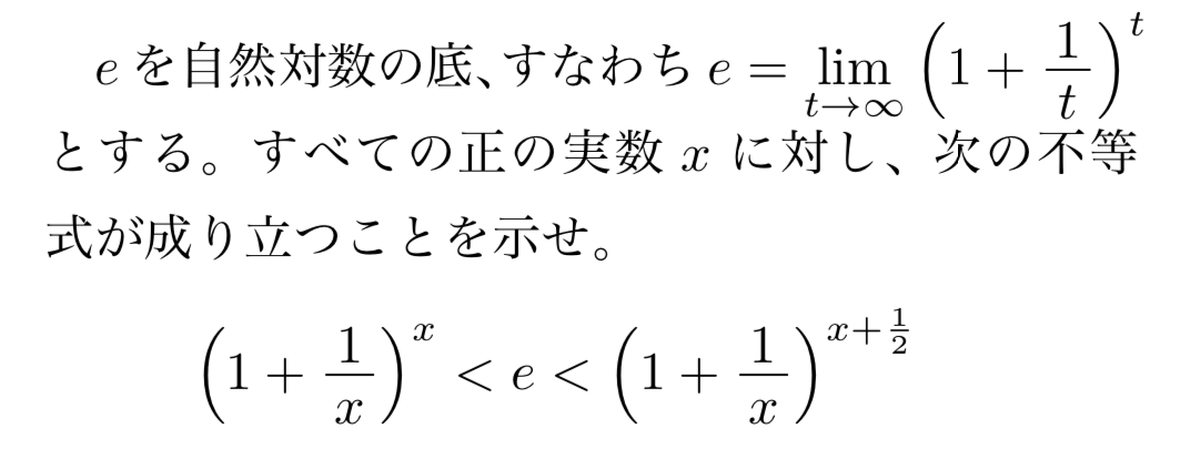 2016年の東大理系数学第一問で出題された問題です。左辺と右辺はどちらも極限がeになることはすぐに分かるので、左辺が単調増加することと右辺が単調減少することを示してあげれば証明完了です。