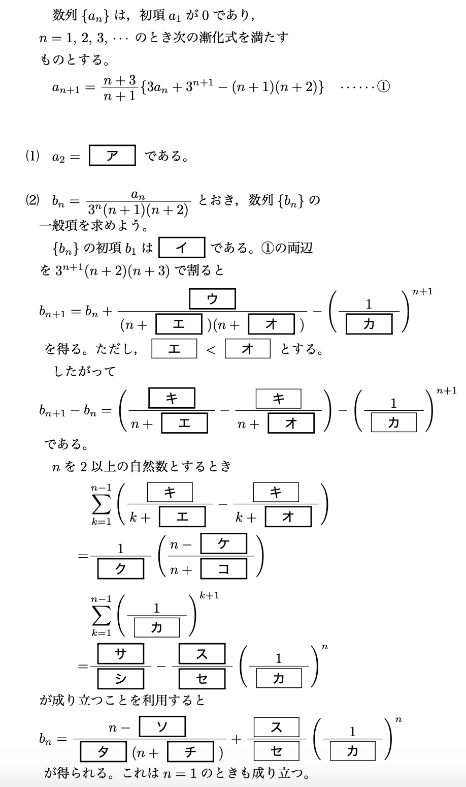 階差数列の公式は、∑k=1n−1という形が出てくるので、n≧2のときでしか使えないのでした。そのため、問題文では、「nを2以上の自然数とするとき」と書かれています。