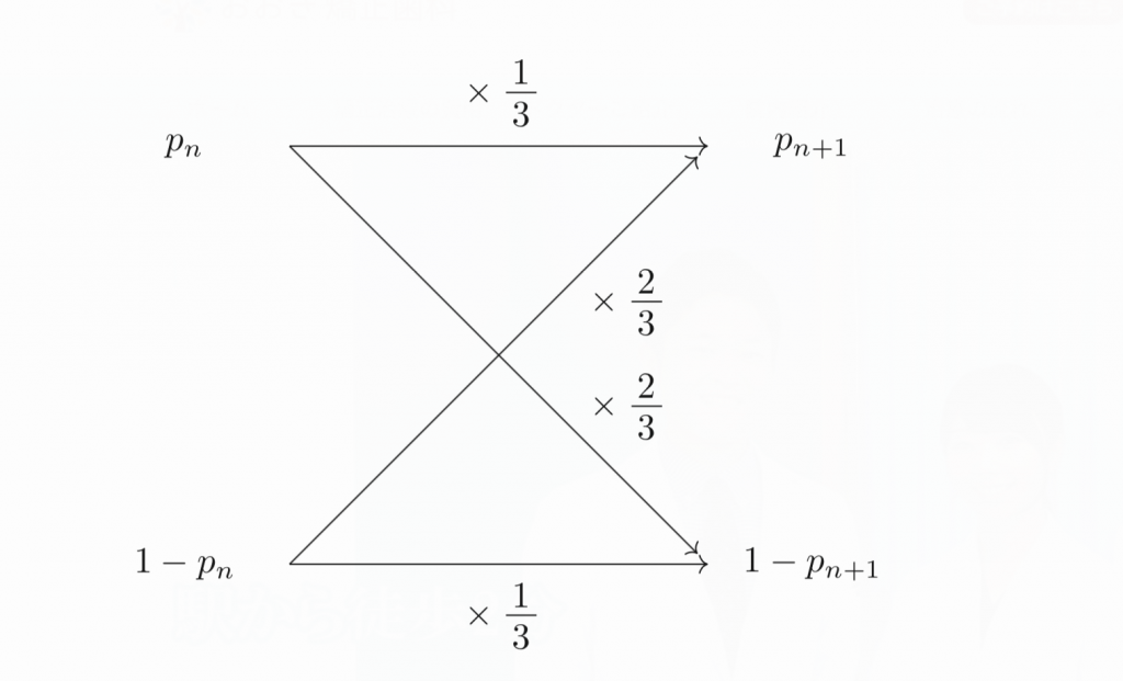 あとは、遷移図を描いて、漸化式を立てて、それを解いてあげれば確率が求まります。