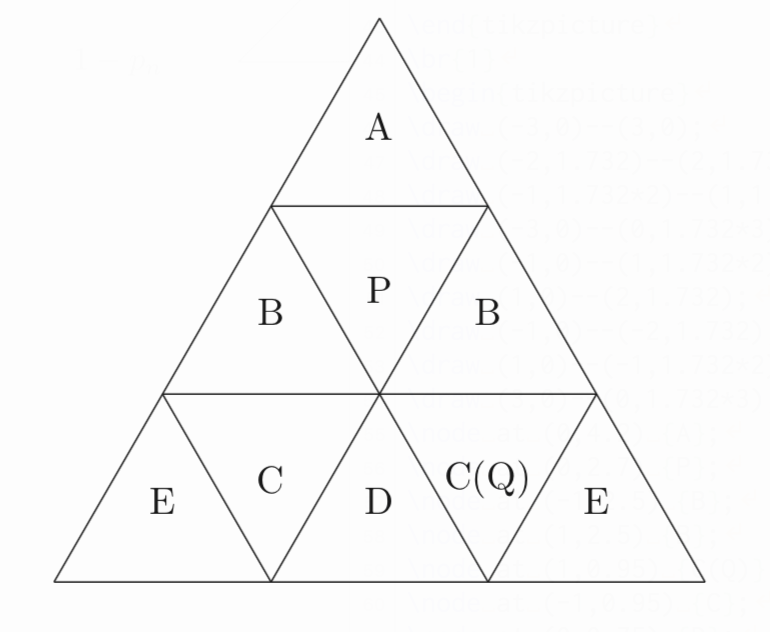 図のように、正三角形を9つの部屋に辺で区切り、部屋、を定める。1つの球が部屋を出発し、1秒ごとに、そのまま部屋にとどまることなく、辺を共有する隣の部屋に等確率で移動する。球が秒後に部屋にいる確率を求めよ。(2012年東大文系第3問、理系第2問)