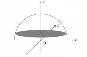 そして、z=t(0<t<1)という平面で切断したときに、ちょうどこの半球の体積が2等分されるようなtを求めてあげればOKですね。さらに、1−tがちょうど32になったとすれば、料理の世界で言われていることは数学的にも正しいことになります。