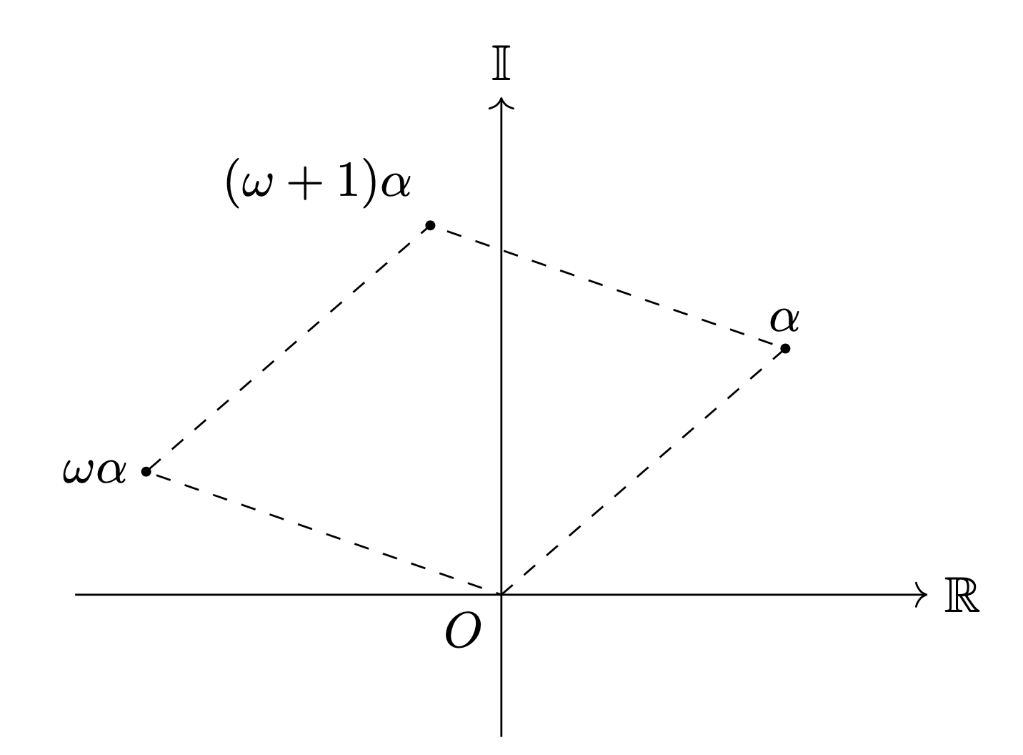 α,ωα,(ω+1)αを複素数平面上に図示すると以下のようになります。
